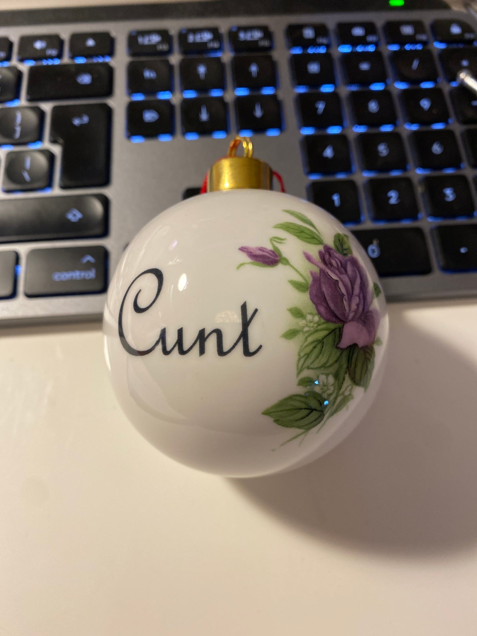 This is just the most beautiful bauble in the world with a very rude word on.  It adorns the finest Christmas trees in the world, delicate and is made in beautiful fine bone china.  You don't really need to put your baubles away after Christmas do you.
